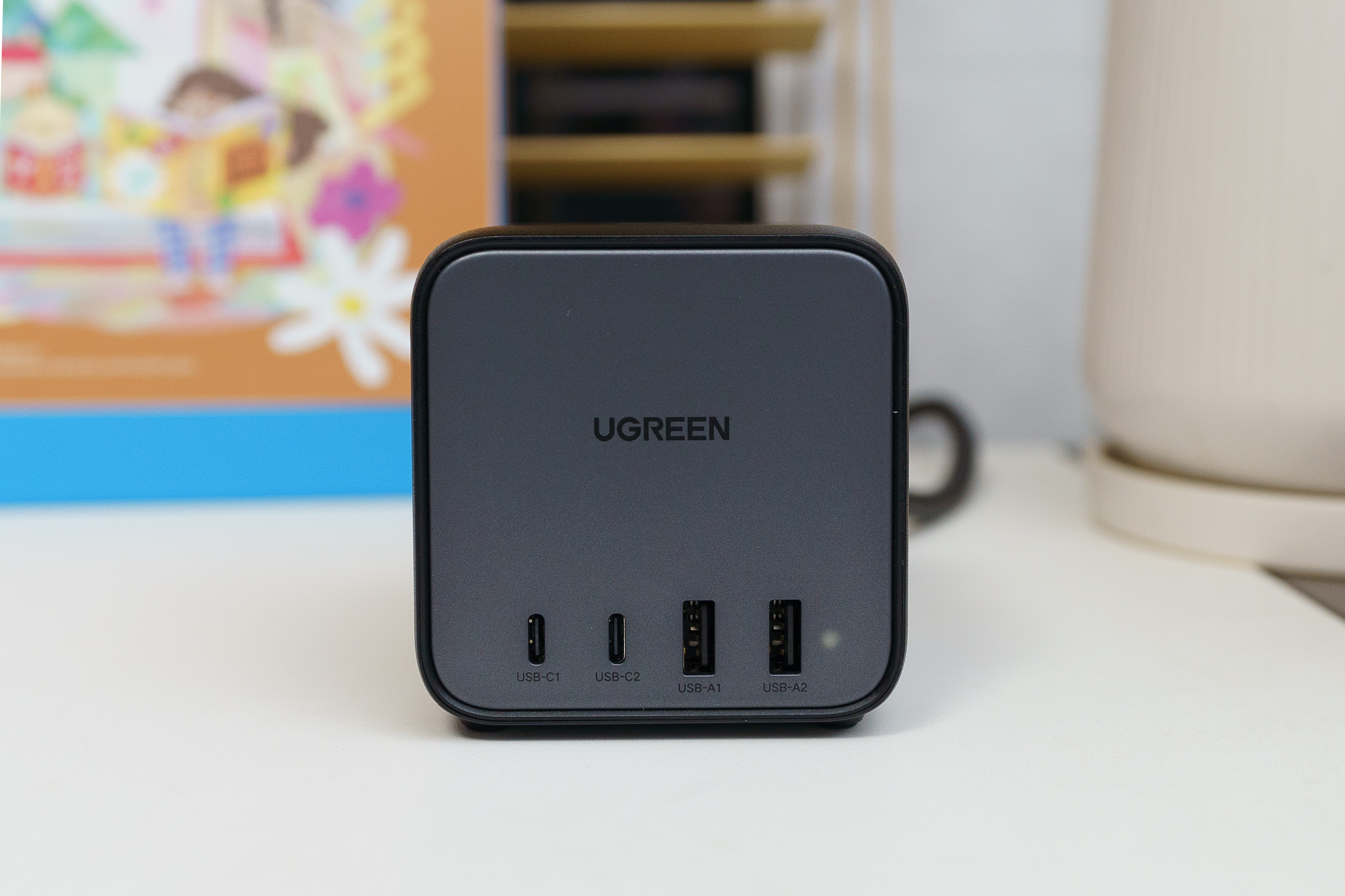 유그린 멀티탭 PD 65W 충전기로 일반 콘센트 3개와 USB-C 2개, USB-A 2개 포트가지고 있는 제품으로