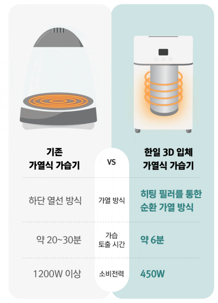 일반 가열식 가습기와 비교해보면 가습 토출 시간과 소비 전력에서 상당한 장점이 보인다.